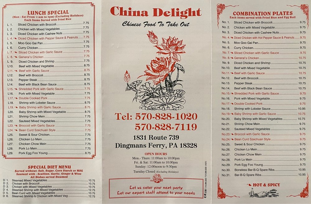 China Delight in Dingmans Ferry, PA offers a variety of Chinese dishes with a cozy restaurant setting. Customers rave about the fresh and delicious food, mentioning favorites like the cheese wontons, bone-in spareribs, Generals Chicken, egg rolls, fried rice, soup, beef chow fun, and lemon chicken. The menu is customizable to accommodate special requests, and the staff is praised for their great customer service. With offerings for takeout, dining in, and various amenities like outdoor seating, Wi-Fi, and TV, China Delight is a convenient and enjoyable option for a meal. The positive reviews and delicious dishes make China Delight a must-try for those craving authentic Chinese cuisine in the area.